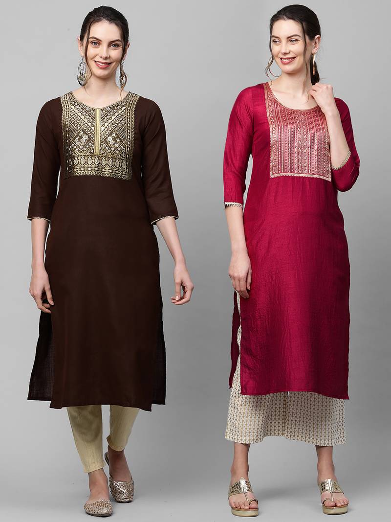 Indo Era Yoke Design Polyester Brown & Maroon Straight Pack Of 2 Kurtas