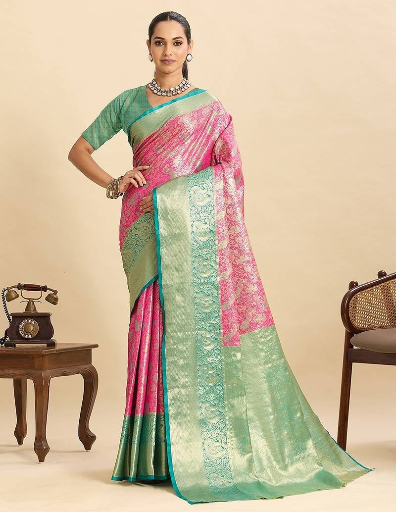 • Saree : Color- Pink / Fabric- Art Silk • Blouse : Color- Green / Fabric- Art Silk Saree Details