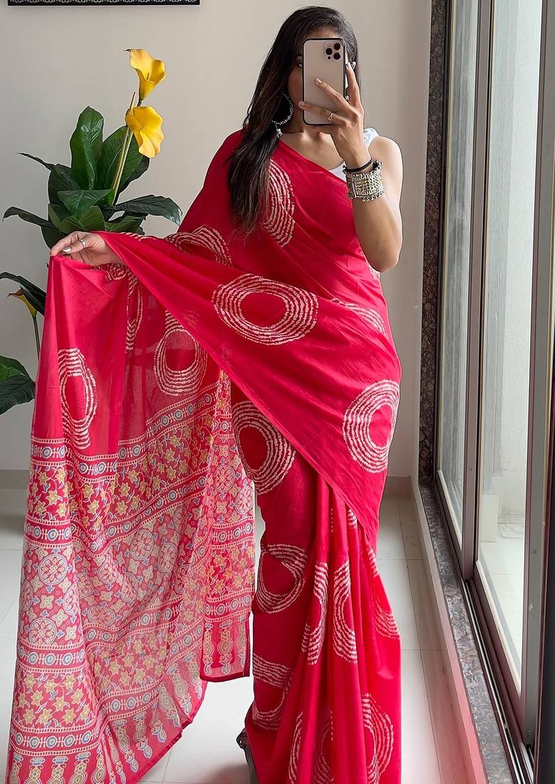 • Saree : Color- Pink / Fabric- Pure Cotton • Blouse : Color- Pink / Fabric- Cotton Saree Details