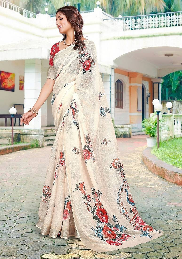 Beige Printed Pure Cotton Beige Saree With Blouse