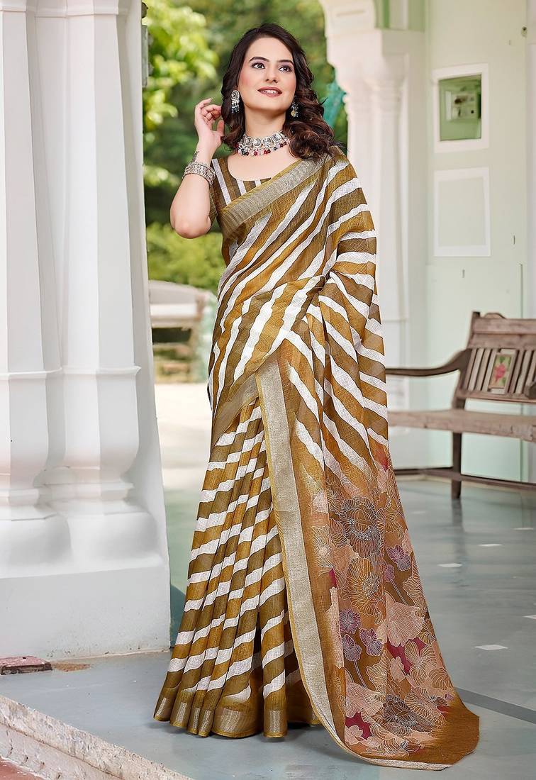 Brown Printed Pure Cotton Brown Saree With Blouse