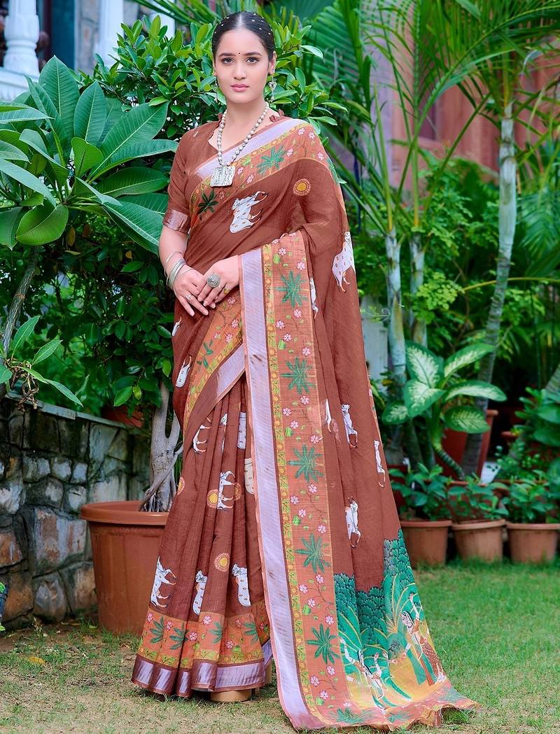 Brown Printed Pure Cotton Brown Saree With Blouse