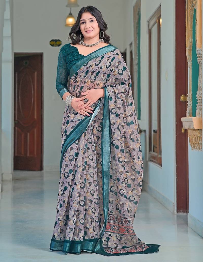 Grey Printed Pure Cotton Grey Saree With Blouse
