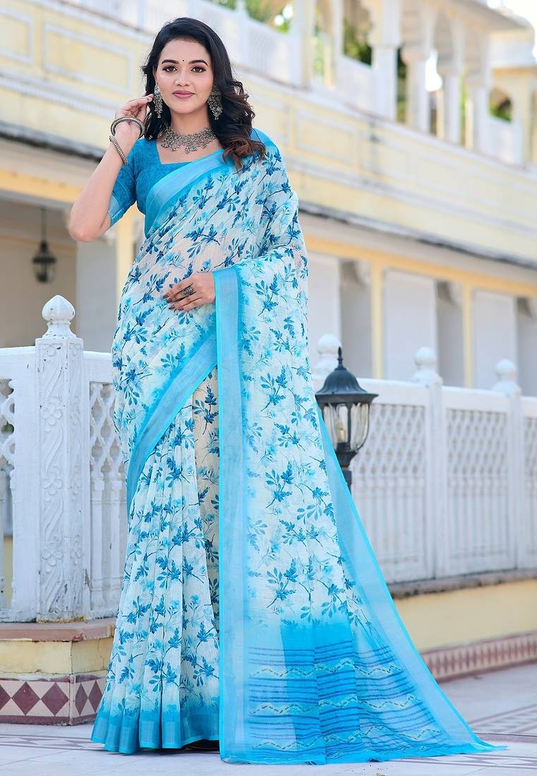 Light Blue Printed Pure Cotton Light Blue Saree With Blouse