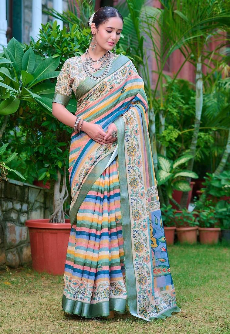 Multicolor Printed Pure Cotton Multicolor Saree With Blouse