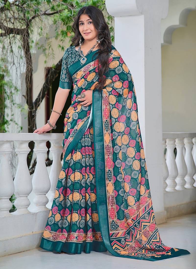 Multicolor Printed Pure Cotton Multicolor Saree With Blouse