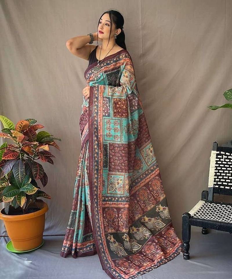 Multicolor Printed Pure Cotton Multicolor Saree With Blouse