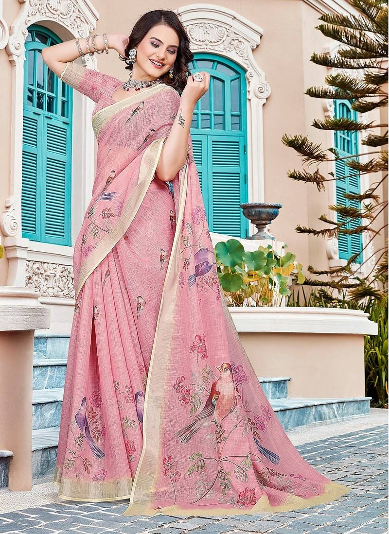 Peach Printed Pure Cotton Peach Saree With Blouse