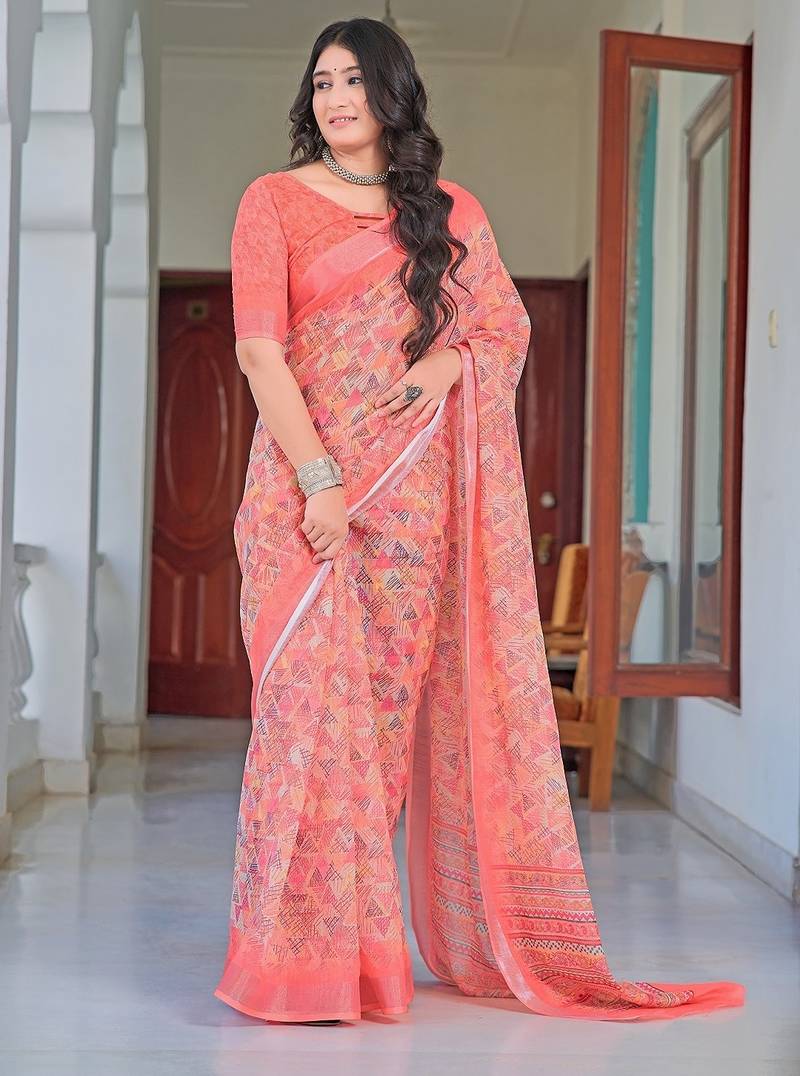 Peach Printed Pure Cotton Peach Saree With Blouse