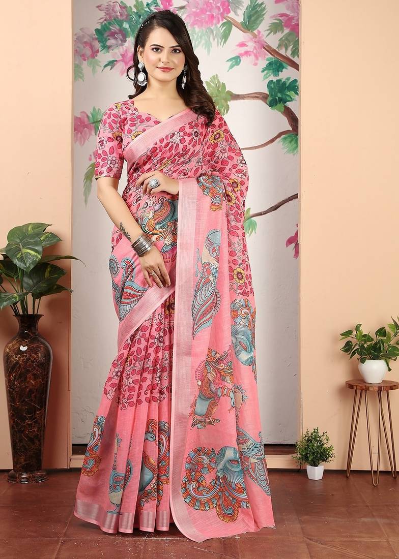 Peach Printed Pure Cotton Peach Saree With Blouse