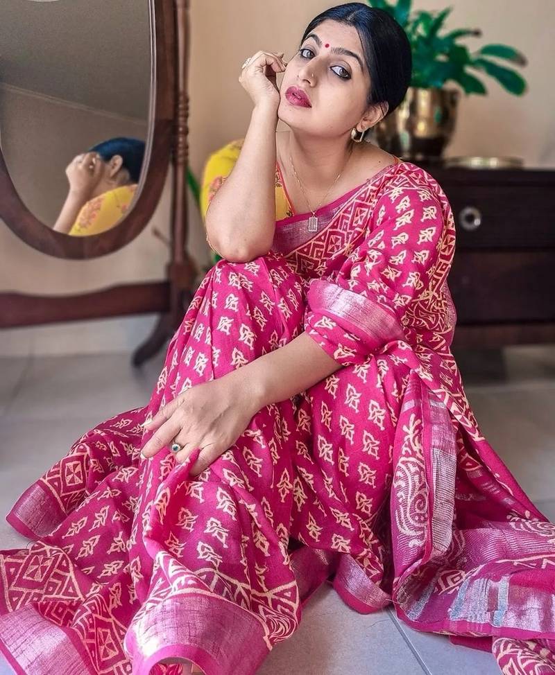 Pink Printed Pure Cotton Pink Saree With Blouse