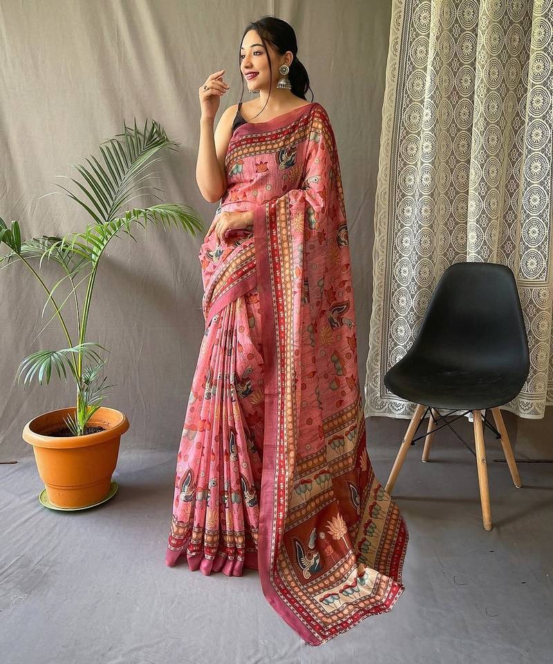 Pink Printed Pure Cotton Pink Saree With Blouse