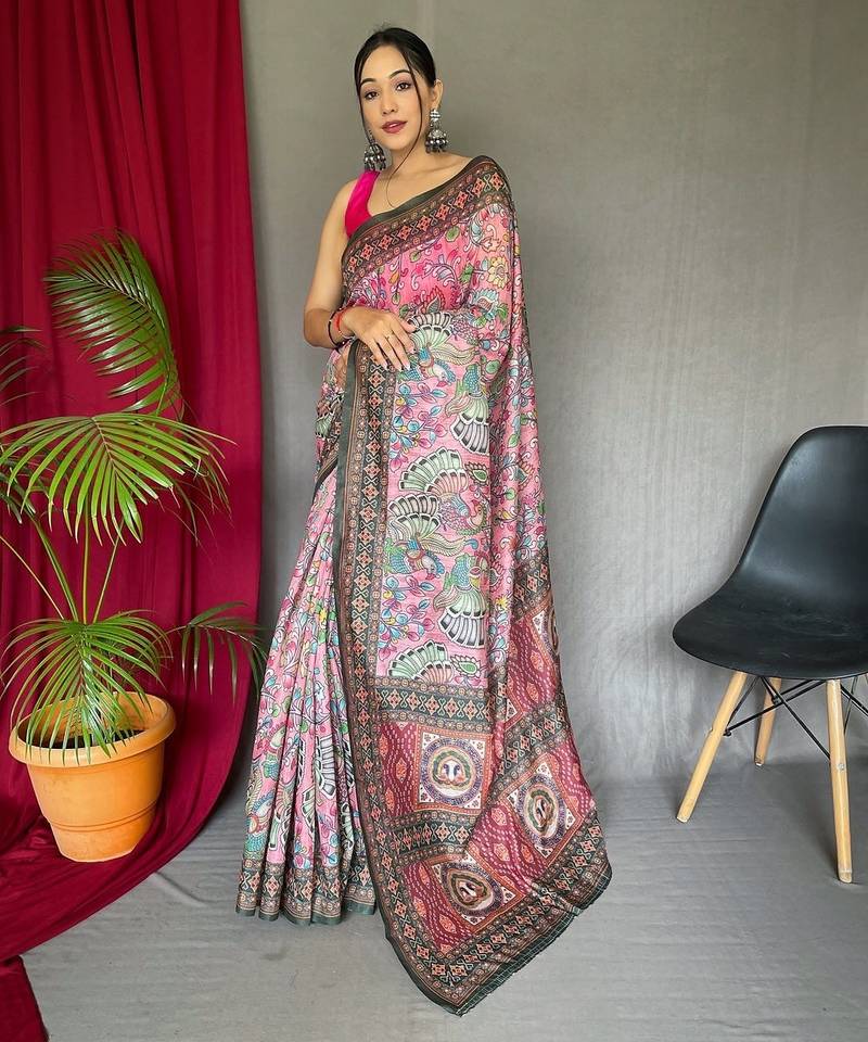 Pink Printed Pure Cotton Pink Saree With Blouse