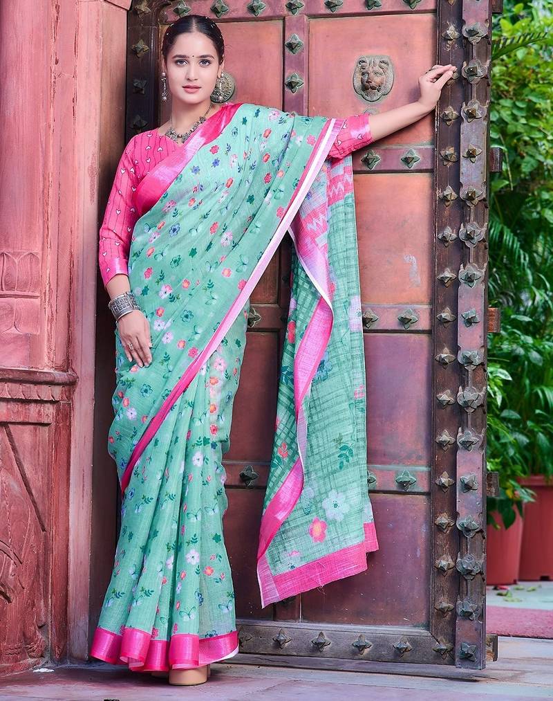 Sea Green Printed Pure Cotton Sea Green Saree With Blouse
