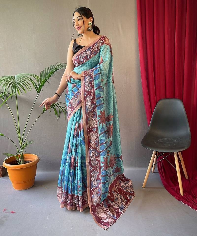 Sky Blue Printed Pure Cotton Sky Blue Saree With Blouse