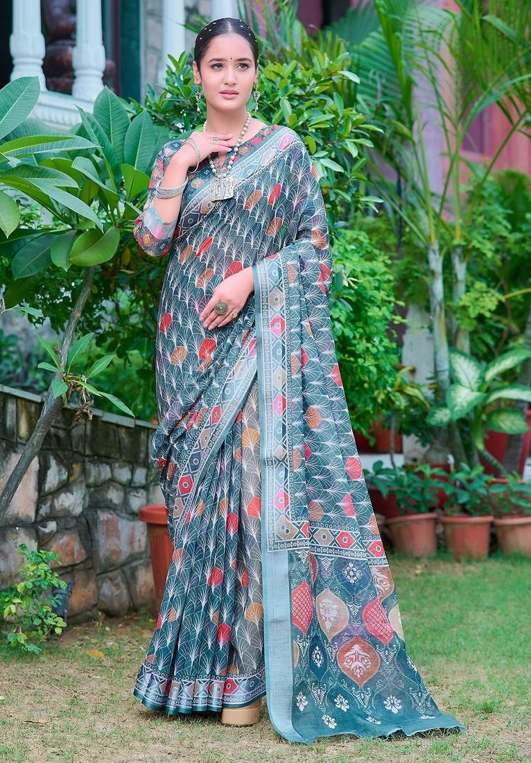 Teal Printed Pure Cotton Teal Green Saree With Blouse