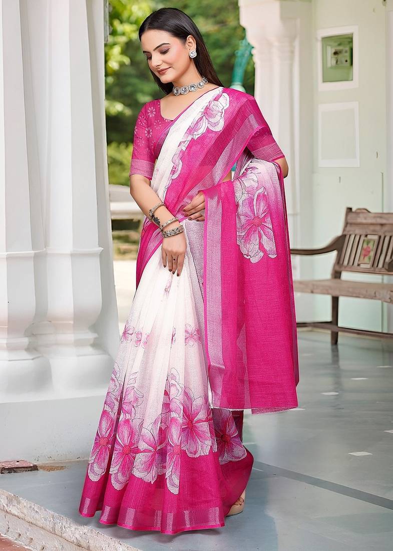 White Printed Pure Cotton White, Pink Saree With Blouse