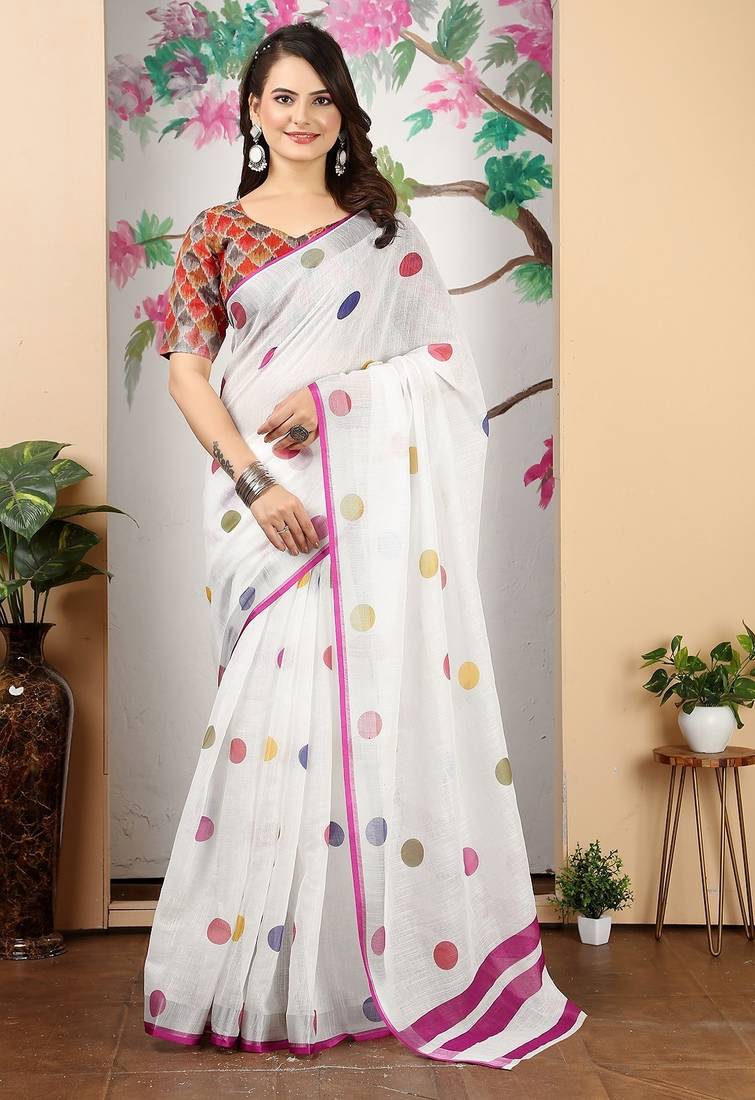 White Printed Pure Cotton White Saree With Blouse