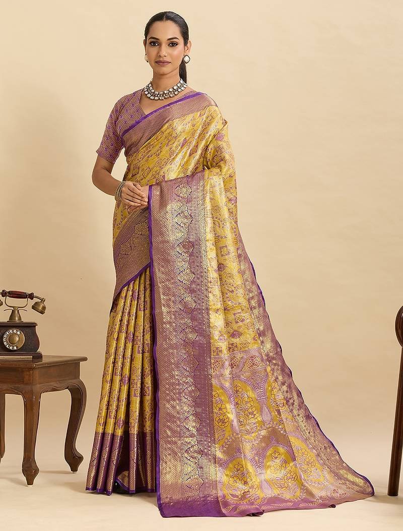 Yellow Art Silk Woven Kanjivaram Silk Saree With Blouses