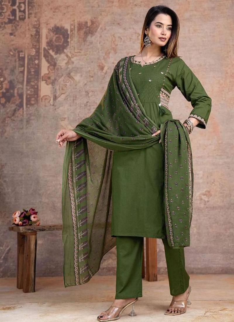 Beautiful Jaipuri A Green Embroidered Kurta Suit Set With A Matching Dupatta And Trousers.