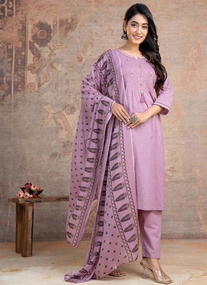 Beautiful Jaipuri A Lavender Ethnic Printed Cotton Kurta Set With A Dupatta.
