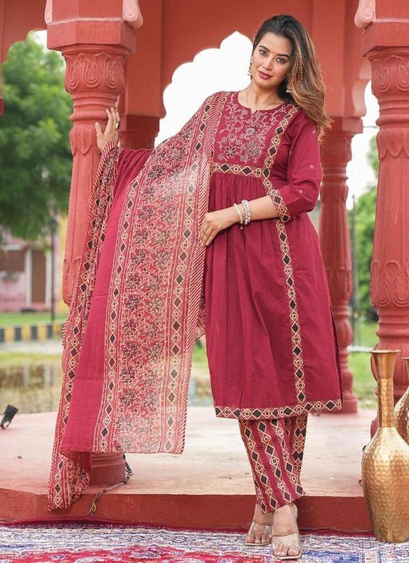 Beautiful Jaipuri Maroon A Line Kurta Set With A Printed Dupatta And Pants