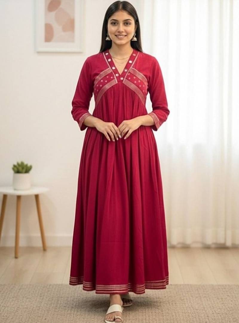Ethnic motifs embroidered I Anarkali shape I Panelled style I V-neck, three-quarter regular sleeves I Na pockets thread work detail I Calf length length with straight hem I Cotton blend knitted and woven fabric *Material - Cotton 60*60* I *Work Embroidery and original mirror work I Kurti length - 48-50inches approx I Pant length - 38 inches approx I Dupatta length- 2.2meter approx I *Size available*- *38,40,42,44,46*