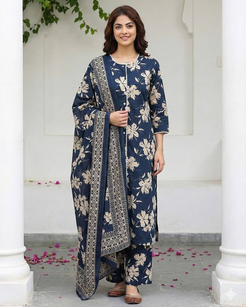 • Product Id : 4723342 • Package Details : 1 Kurta /1 Trouser / 1 Dupatta • Type : Kurta Sets • Work : Printed • Type : Floral Print • Sleeve : Quarter Sleeve • Neck Style : Round Neck • Color : Blue • Fabric : Pure Cotton • Stitching : Stitched • Length : 46.0 Payments [+]