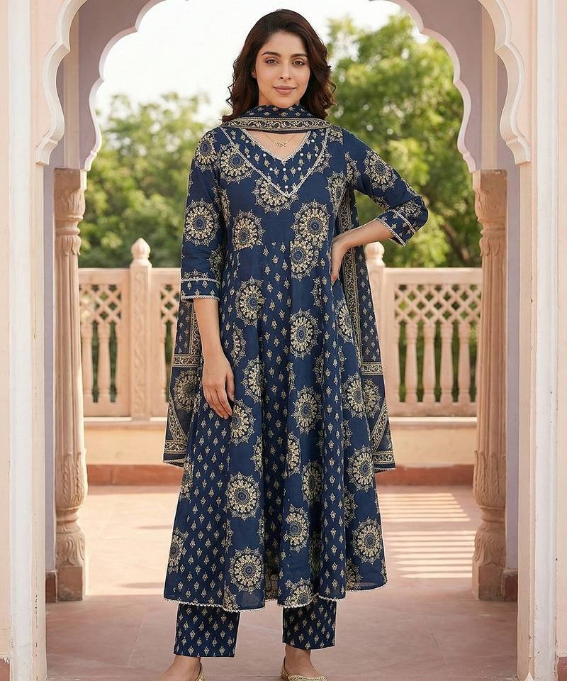 • Product Id : 4723452 • Package Details : 1 Kurta /1 Trouser / 1 Dupatta • Type : Kurta Sets • Work : Printed • Type : Floral Print • Sleeve : Quarter Sleeve • Neck Style : V Neck • Color : Blue • Fabric : Pure Cotton • Stitching : Stitched • Length : 48.0 Payments [+]