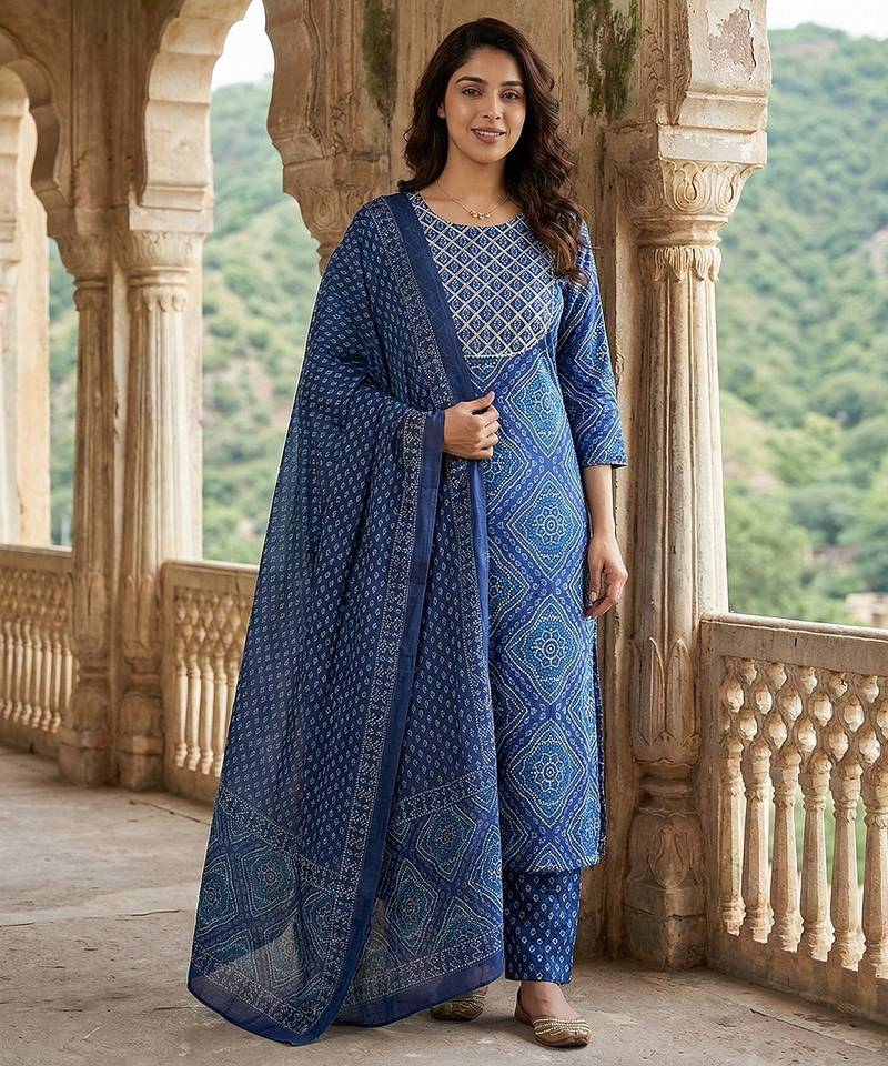 • Product Id : 4723436 • Package Details : 1 Kurta /1 Trouser / 1 Dupatta • Type : Kurta Sets • Work : Printed • Type : Floral Print • Sleeve : Quarter Sleeve • Neck Style : Round Neck • Color : Blue • Fabric : Pure Cotton • Stitching : Stitched • Length : 46.0 Payments [+]