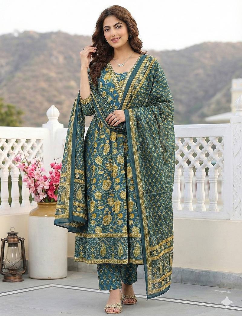 • Product Id : 4723361 • Package Details : 1 Kurta /1 Trouser / 1 Dupatta • Type : Kurta Sets • Work : Printed • Type : Floral Print • Sleeve : Quarter Sleeve • Color : Green • Fabric : Pure Cotton • Stitching : Stitched • Neck Style : Square Neck Kameez • Length : 48.0 Payments [+]
