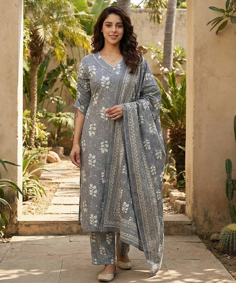 • Product Id : 4723448 • Package Details : 1 Kurta /1 Trouser / 1 Dupatta • Type : Kurta Sets • Work : Printed • Type : Floral Print • Sleeve : Quarter Sleeve • Neck Style : V Neck • Color : Grey • Fabric : Pure Cotton • Stitching : Stitched • Length : 46.0 Payments [+]