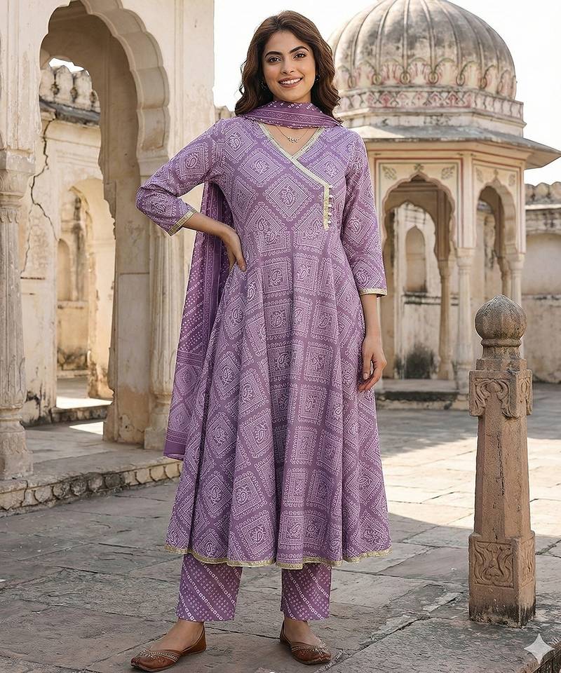 Anouk Light Purple Pure Cotton Anarkali Three-Quarter Sleeves V-Neck With Calf Length Bandhani Print Kurta Set With Dupatta
