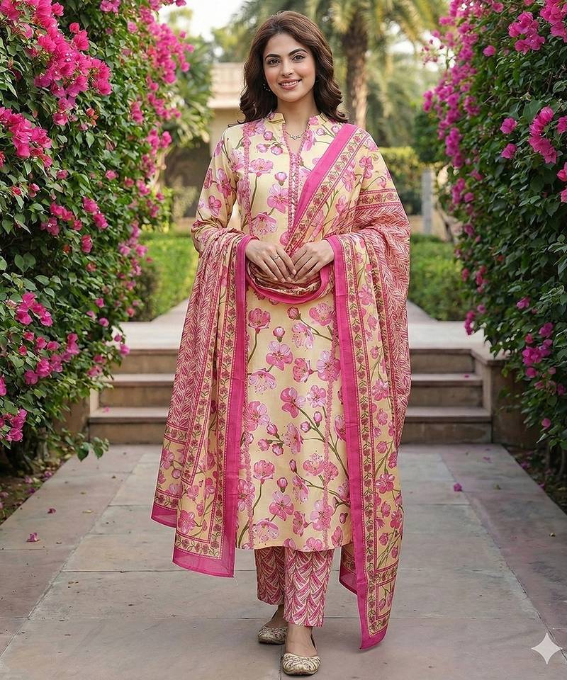 • Product Id : 4723326 • Package Details : 1 Kurta /1 Trouser / 1 Dupatta • Type : Kurta Sets • Work : Printed • Type : Floral Print • Sleeve : Quarter Sleeve • Color : Yellow • Fabric : Pure Cotton • Stitching : Stitched • Length : 46.0 Payments [+]