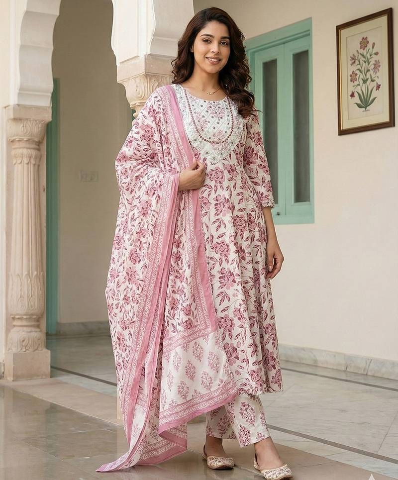 • Product Id : 4723387 • Package Details : 1 Kurta /1 Trouser / 1 Dupatta • Type : Kurta Sets • Work : Printed • Type : Floral Print • Sleeve : Quarter Sleeve • Neck Style : Round Neck • Color : Maroon • Fabric : Pure Cotton • Stitching : Stitched • Length : 48.0 Payments [+]