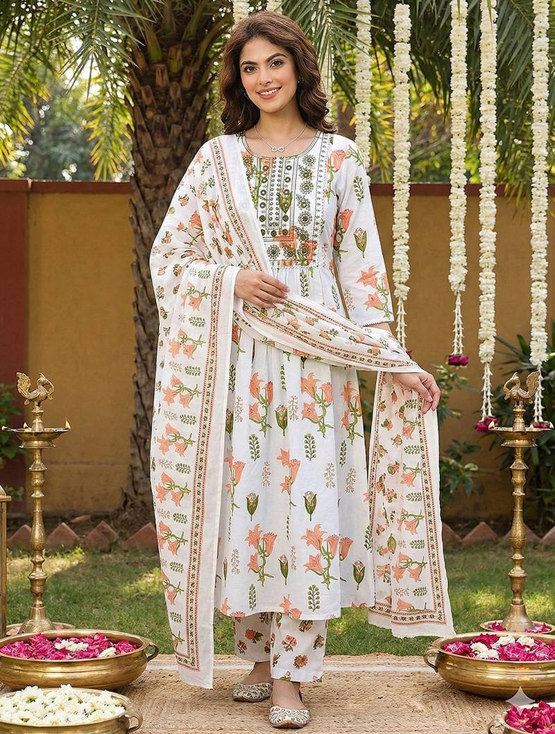 Anouk Orange And White Pure Cotton Anarkali Kurta Set With Round Neck,Na Pleated Top Design Floral Print Soft Fabric Ideal For Festive Casual Occasions.