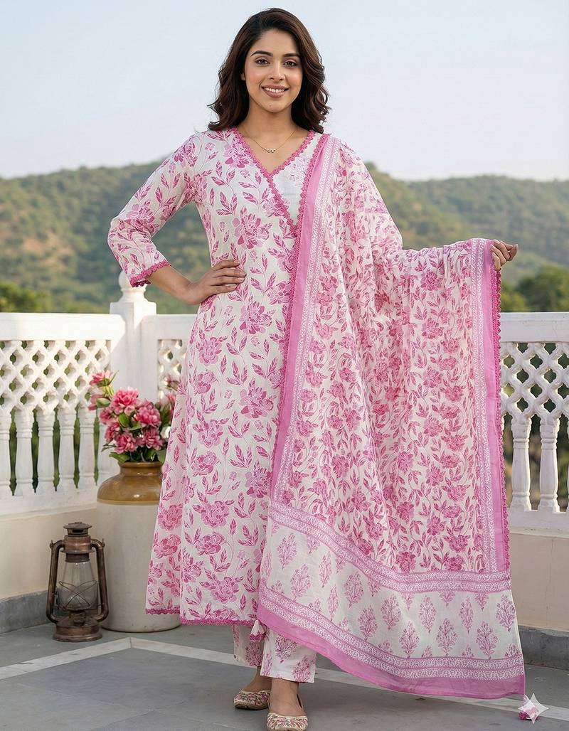 • Product Id : 4723341 • Package Details : 1 Kurta /1 Trouser / 1 Dupatta • Type : Kurta Sets • Work : Printed • Type : Floral Print • Sleeve : Quarter Sleeve • Neck Style : V Neck • Color : Pink • Fabric : Pure Cotton • Stitching : Stitched • Length : 48.0 Payments [+]