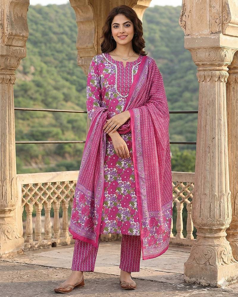 • Product Id : 4723330 • Package Details : 1 Kurta /1 Trouser / 1 Dupatta • Type : Kurta Sets • Work : Printed • Type : Floral Print • Sleeve : Quarter Sleeve • Neck Style : Round Neck • Color : Pink • Fabric : Pure Cotton • Stitching : Stitched • Length : 46.0 Payments [+]