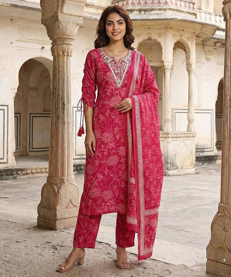 • Product Id : 4723336 • Package Details : 1 Kurta /1 Trouser / 1 Dupatta • Type : Kurta Sets • Work : Printed • Type : Floral Print • Sleeve : Quarter Sleeve • Neck Style : Round Neck • Color : Pink • Fabric : Pure Cotton • Stitching : Stitched • Length : 46.0 Payments [+]