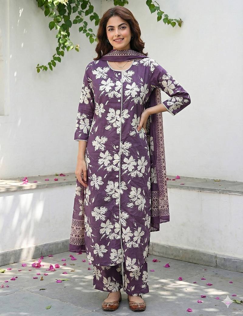 • Product Id : 4723344 • Package Details : 1 Kurta /1 Trouser / 1 Dupatta • Type : Kurta Sets • Work : Printed • Type : Floral Print • Sleeve : Quarter Sleeve • Neck Style : Round Neck • Color : Purple • Fabric : Pure Cotton • Stitching : Stitched • Length : 46.0 Payments [+]