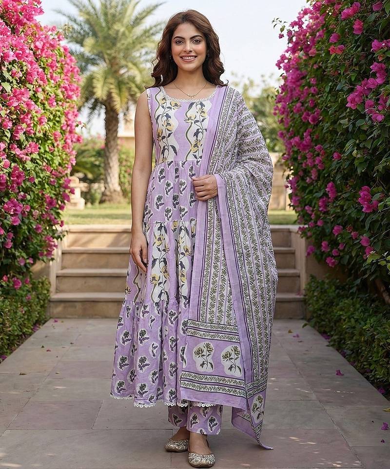 Anouk Purple And Cream Pure Cotton Anarkali Kurta Set With Round Neck,Na Gathered Or Pleated Top Design Floral Print Soft Fabric Ideal For Festive Casual Occasions.