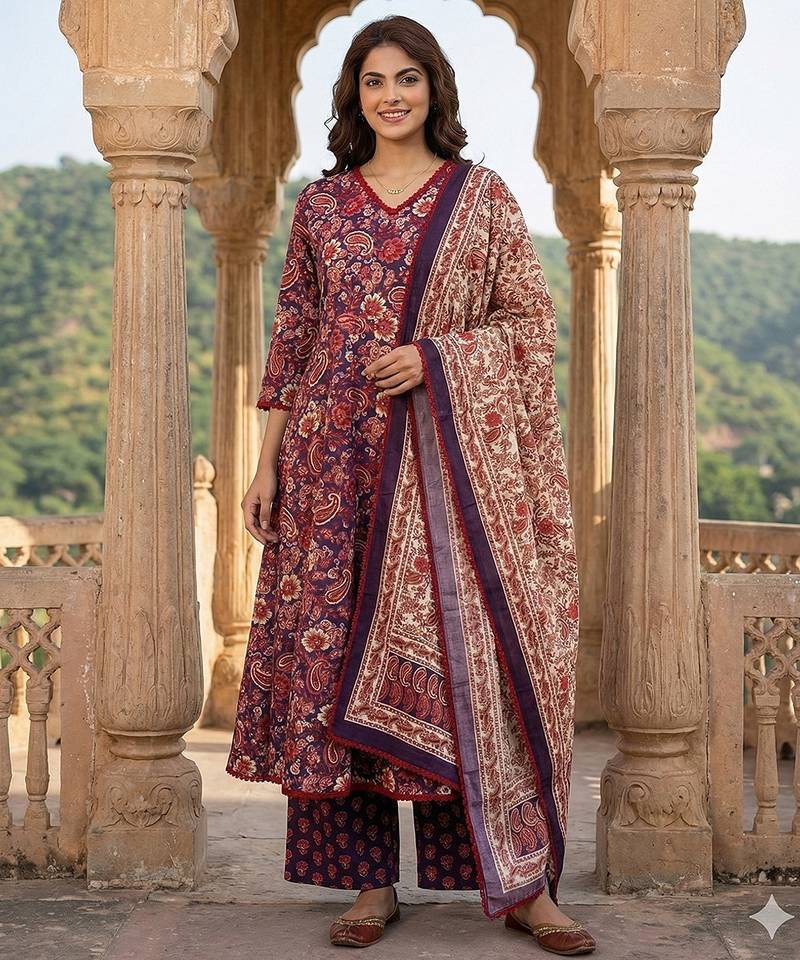 Anouk Purple And Red Pure Cotton A-Line Kurta Set With V-Neck,Na Regular Top Design Paisley Soft Fabric Ideal For Festive Casual Occasions.