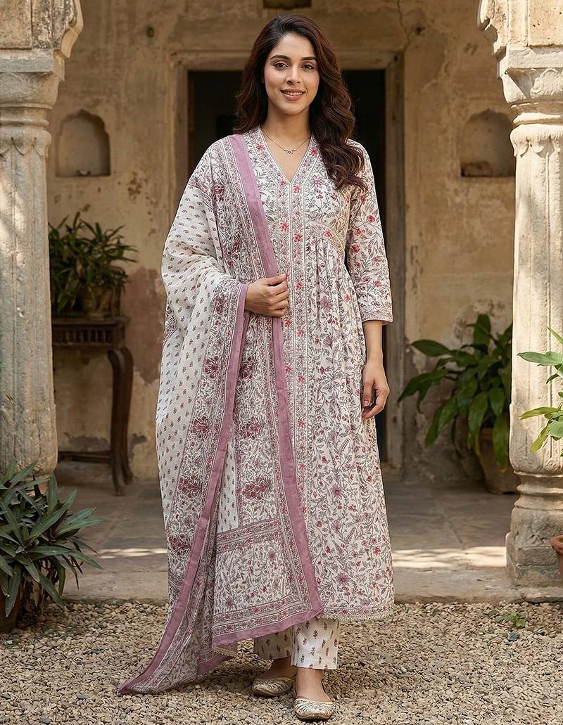 • Product Id : 4723338 • Package Details : 1 Kurta /1 Trouser / 1 Dupatta • Type : Kurta Sets • Work : Printed • Type : Floral Print • Sleeve : Quarter Sleeve • Neck Style : V Neck • Color : White • Fabric : Pure Cotton • Stitching : Stitched • Length : 48.0 Payments [+]