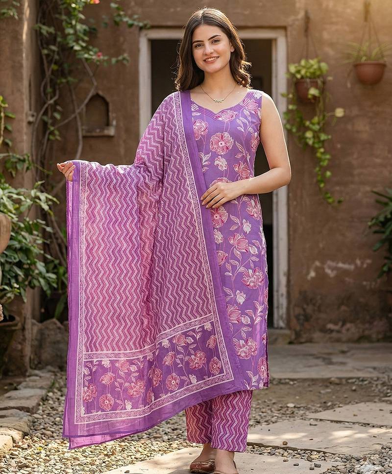 • Product Id : 4723314 • Package Details : 1 Kurta /1 Trouser / 1 Dupatta • Type : Kurta Sets • Work : Printed • Type : Floral Print • Sleeve : Sleeveless • Color : Purple • Fabric : Pure Cotton • Stitching : Stitched • Neck Style : Sweetheart Neck Kameez • Length : 46.0 Payments [+]