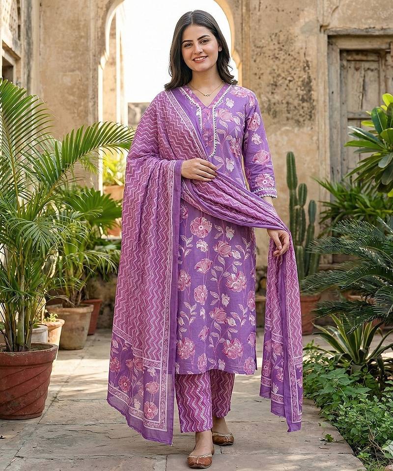 • Product Id : 4723415 • Package Details : 1 Kurta /1 Trouser / 1 Dupatta • Type : Kurta Sets • Work : Printed • Type : Floral Print • Sleeve : Quarter Sleeve • Neck Style : V Neck • Color : Purple • Fabric : Pure Cotton • Stitching : Stitched • Length : 46.0 Payments [+]