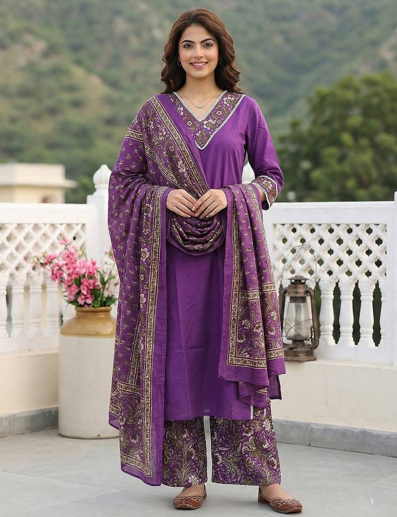 • Product Id : 4723446 • Package Details : 1 Kurta /1 Palazzos / 1 Dupatta • Type : Kurta Sets • Work : Plain • Type : Abstract Print • Sleeve : Quarter Sleeve • Neck Style : V Neck • Color : Purple • Fabric : Pure Cotton • Stitching : Stitched • Length : 46.0 Payments [+]