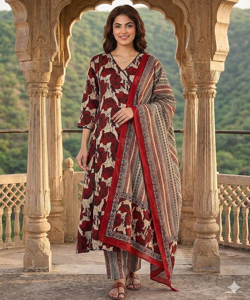 Anouk Red And Baige Pure Cotton A-Line Kurta Set With V-Neck,Front Slits Angrakha Top Design Floral Print Soft Fabric Ideal For Festive Casual Occasions.