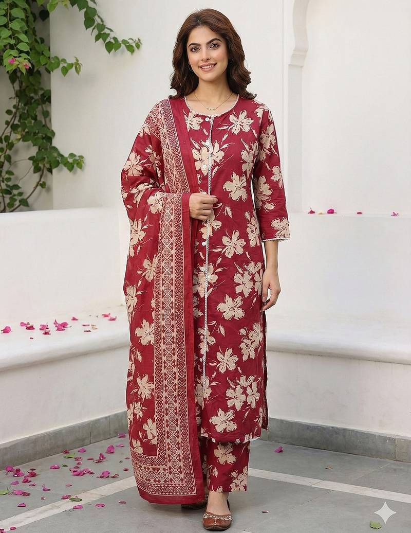 • Product Id : 4723345 • Package Details : 1 Kurta /1 Trouser / 1 Dupatta • Type : Kurta Sets • Work : Printed • Type : Floral Print • Sleeve : Quarter Sleeve • Neck Style : Round Neck • Color : Red • Fabric : Pure Cotton • Stitching : Stitched • Length : 46.0 Payments [+]