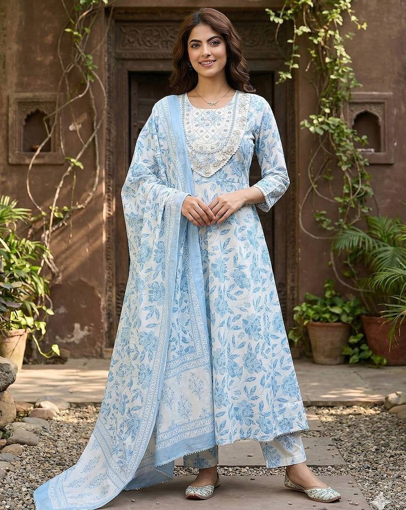 • Product Id : 4723386 • Package Details : 1 Kurta /1 Trouser / 1 Dupatta • Type : Kurta Sets • Work : Printed • Type : Floral Print • Sleeve : Quarter Sleeve • Neck Style : Round Neck • Color : Blue • Fabric : Pure Cotton • Stitching : Stitched • Length : 48.0 Payments [+]