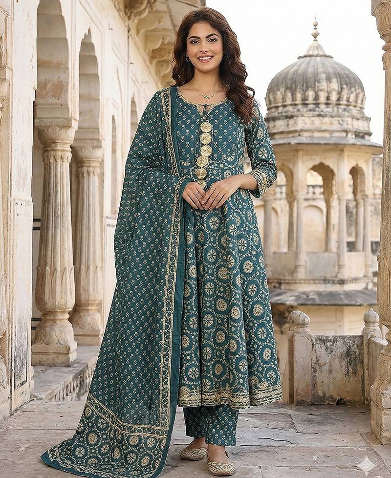 Anouk Teal Blue And Cream Pure Cotton Anarkali Kurta Set With Tie-Up Neck,Na Regular Top Design Floral Print Soft Fabric Ideal For Festive Casual Occasions.